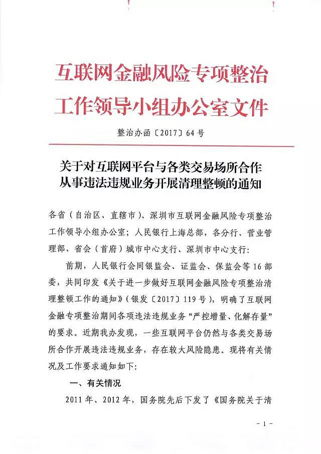 《關于對互聯網平臺與各類交易場所合作從事違法違規業務開展清理整頓的通知》(整治辦函[2017]64號)