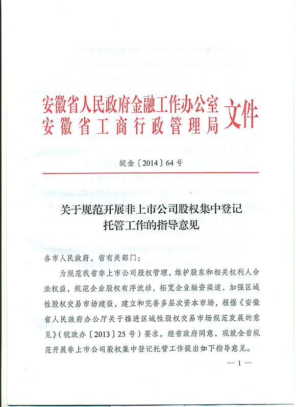 關于規范開展非上市公司股權集中登記托管的指導意見(皖金[2014]64號])